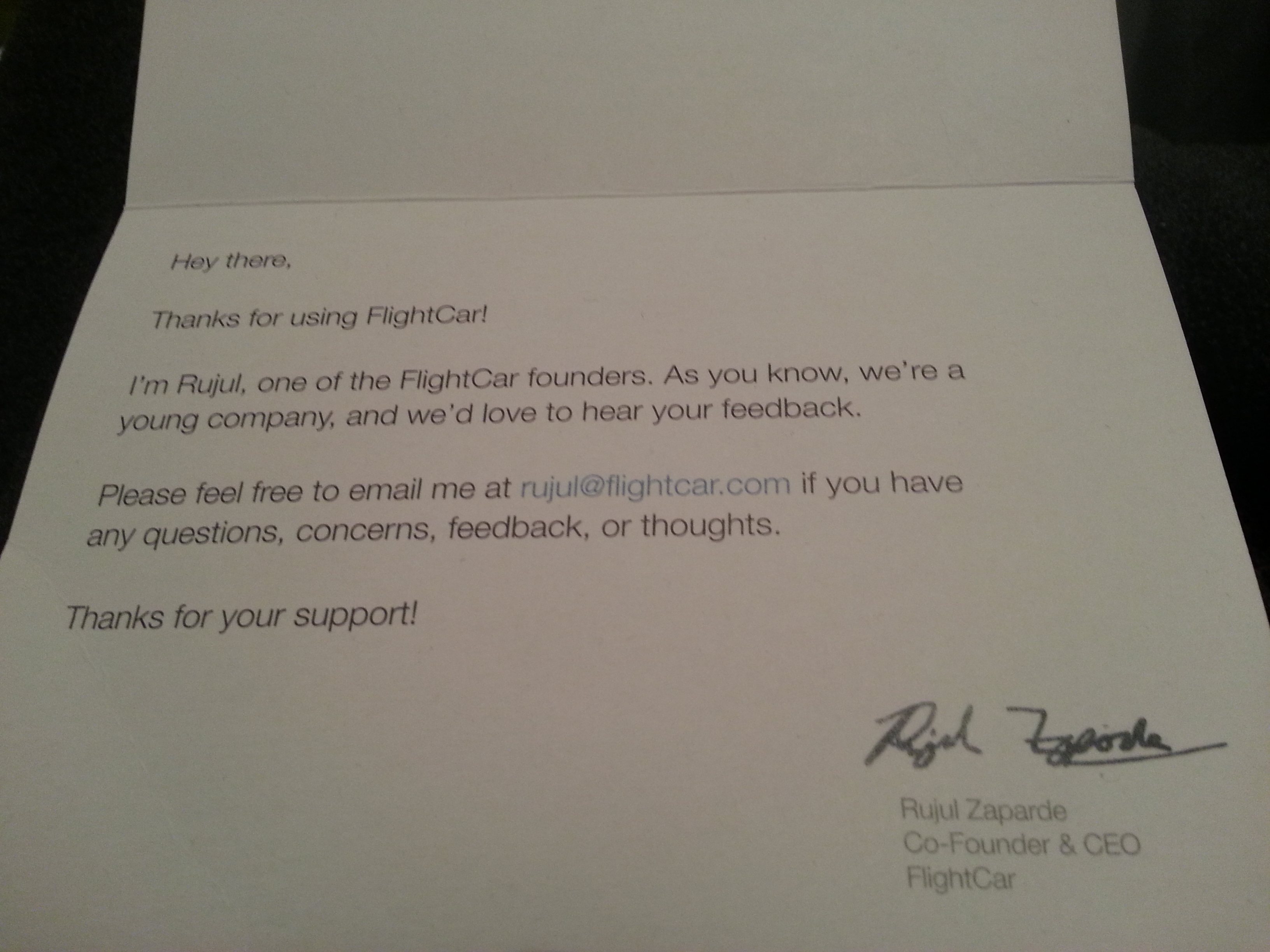 If FlightCar was interested in going the extra mile, a little surprise waiting for the customer could be a nice customer experience touch as well. Often, it’s the little unexpected efforts that make an experience worth remembering and talking about. Gagan Biyani, Co-Founder of Sprig, mentioned how their meals come with a little chocolate that is an unadvertised surprised. His feedback has shown it’s one of most memorable parts of the meal, yet is not the most expensive. Perhaps a chocolate or as a fun novelty (California paper maps, those things you had to fold!) would be fun to have when you jump in your first FlightCar.